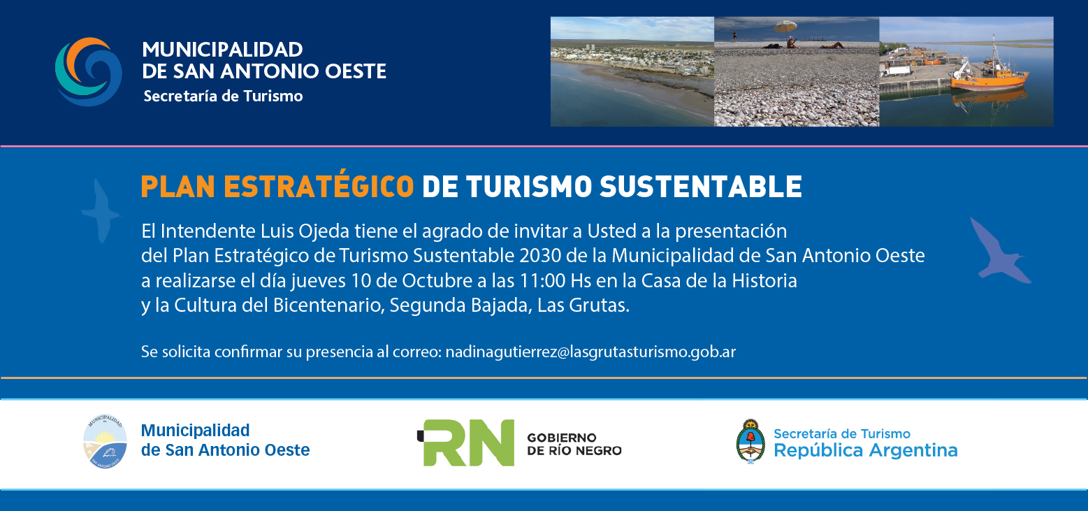 La Secretaria de Turismo de la Municipalidad de San Antonio Oeste, Nadina Gutiérrez informa que este Jueves 10 de Octubre se realizará el acto de presentación del Plan Estratégico de Turismo Sustentable 2030.