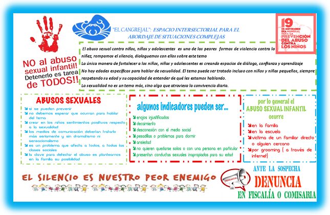 Desde el Espacio de Articulación Intersectorial para el abordaje de problemáticas complejas «EL Cangrejal» estamos comprometidos en la promoción de los derechos de lxs niñxs y adolescentes, y en la prevención de la vulneración de ellos; por ello, teniendo en cuenta que el 19 de noviembre se celebra el Día Mundial para la Prevención del Abuso Sexual Infantil y el 20 de noviembre se conmemora la aprobación en 1989 de la Convención Internacional de los Derechos del Niño por la Asamblea General de las Naciones Unidas, lanzamos esta campaña de difusión de los derechos de lxs niñxs y lxs adolescentes y de prevención del abuso sexual infanto-juvenil.