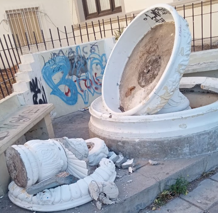 En la mañana de este lunes se registró un nuevo hecho de vandalismo en la ciudad: la fuente histórica ubicada frente al edificio de la Municipalidad apareció destruida, con daños de consideración en su estructura. Ante esta situación, el legislador provincial Luis Noale realizó una denuncia penal para que se investigue lo ocurrido y se identifique a los responsables.