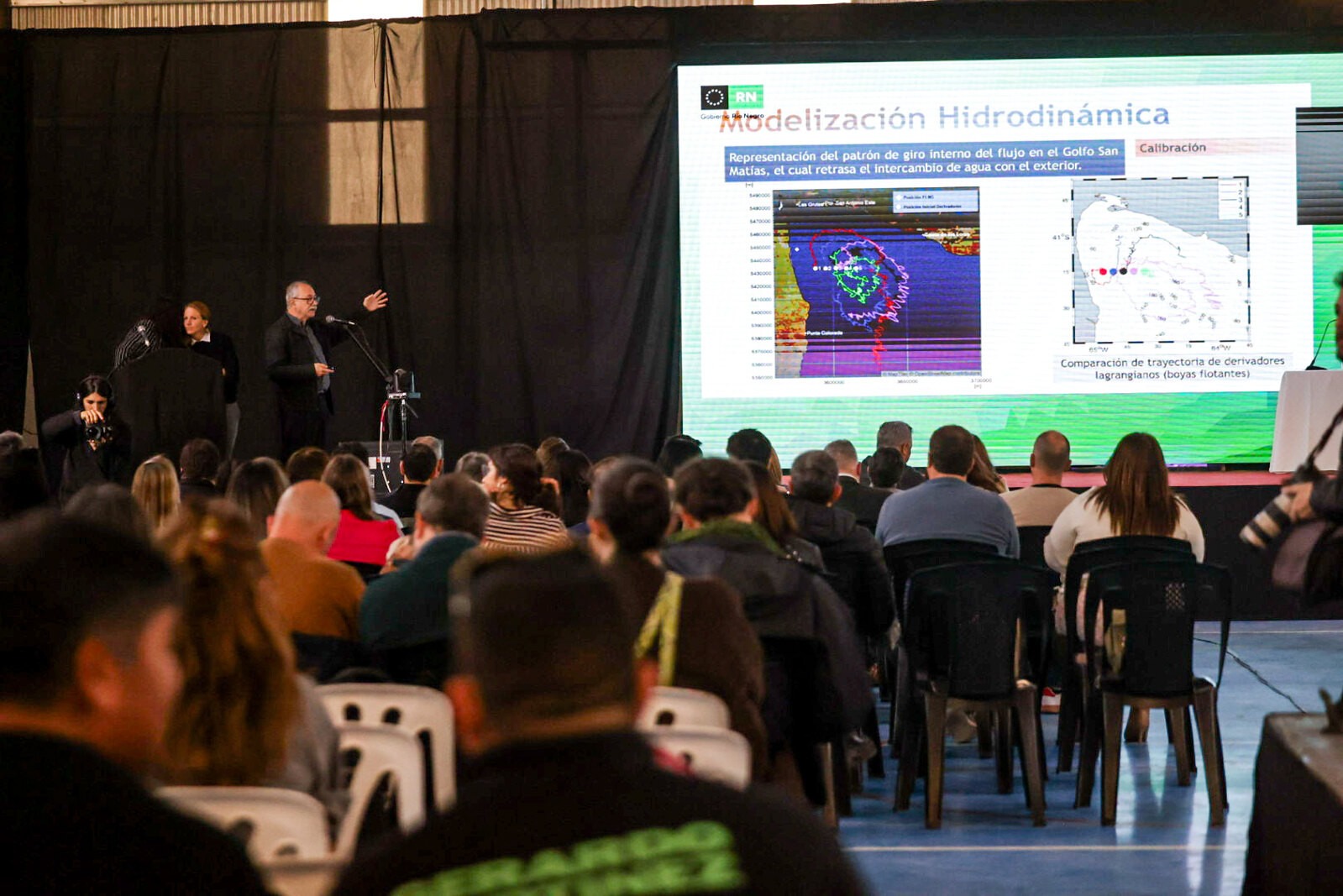 Funcionarios presentes en la mesa protocolar de la Audiencia Pública: la Secretaria de Estado de Energía y Ambiente Sra. Andrea M. Confini, la Secretaria de Ambiente y Cambio Climático Sra. María Judith Jiménez y el intendente de la Municipalidad de San Antonio Oeste, Sr. Adrián Casadei.