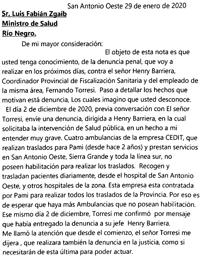 Menciona asimismo que realizará una denuncia al respecto, que actualmente estaría en curso y que mediante una nota dio aviso al ministro de Salud Zgaib (ver a continuación)