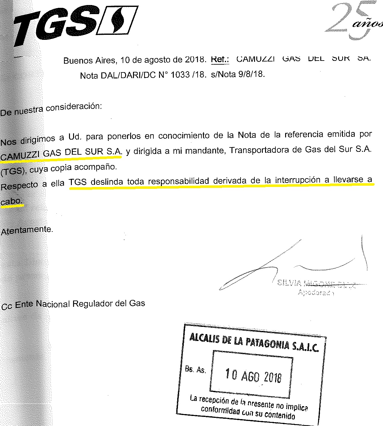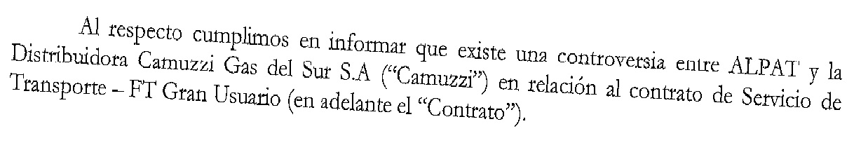 Así es el escrito que recibió la empresa ALPAT, a pesar de que llevaron adelante las negociaciones, Camuzzi procedió a que TGS corte el suministro de gas.