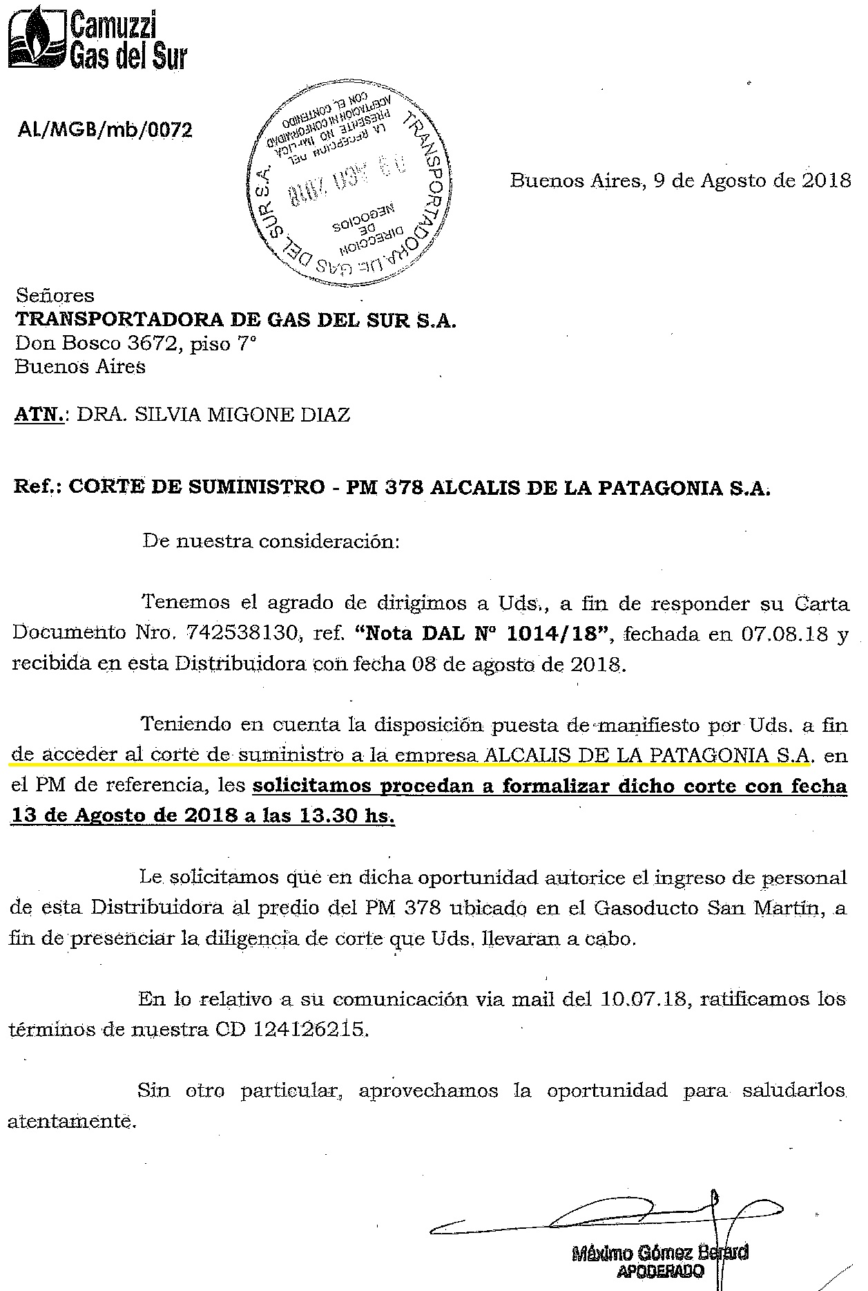 De ese escrito se desprende que el día 9 de agosto Camuzzi emplazó al corte para el día 13 donde el gerente expresa en su contestación que la mediación recién era para este lunes.