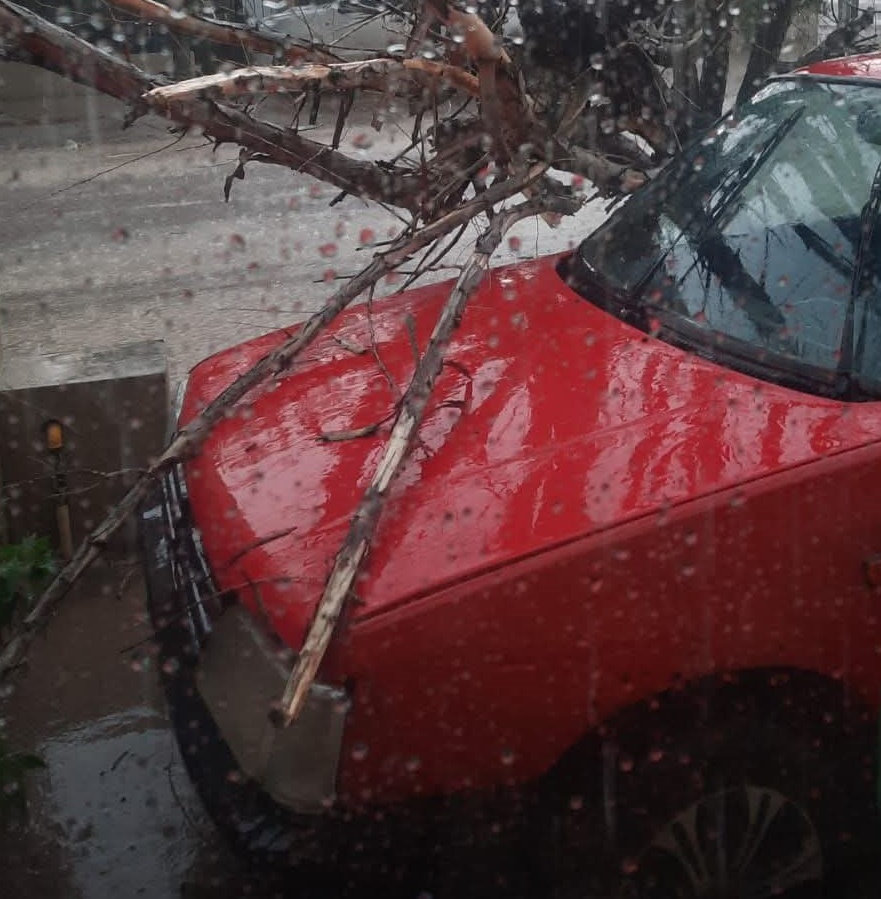 Minutos después, otro móvil se trasladó a la calle Raúl Guccerelli 710, donde otro árbol había caído sobre un vehículo estacionado. Se trataba de un Peugeot 205 que sufrió daños visibles en el parante del lado del acompañante y en parte del capot. El personal procedió a cortar y despejar la zona afectada para evitar riesgos adicionales.